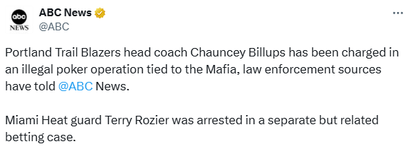 据ABC News报道,消息人士透露,比卢普斯与罗齐尔分别属于两个独立的案件。其中比卢普斯在俄勒冈州的逮捕关联另一起独立但相关的非法赌博案件,该案涉及与黑手党有关的非法扑克经营。他在俄勒冈州被捕,预计将于周五首次出庭。